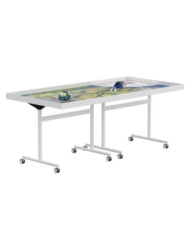 Taula de competició Team BOT per a Robotics for Good i altres. Abatible, amb rodes i fre, superfície rotulable i contorn perimetral desmuntable. Unint-ne dues, s’obtenen les mesures homologades de camp 2362 x 1143 mm.